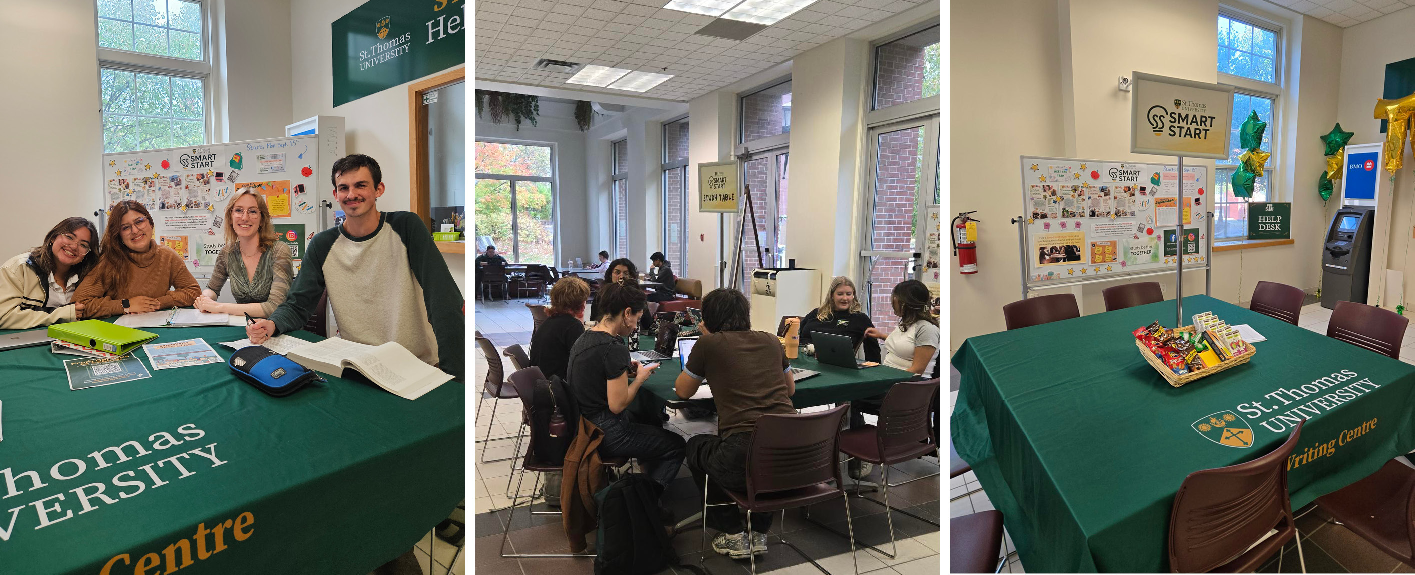 The Smart Start Study Table is located in Sir James Dunn Hall across from the Student Help Desk. The table is available anytime for studying, but will have a Smart Start Leader there during the following times: